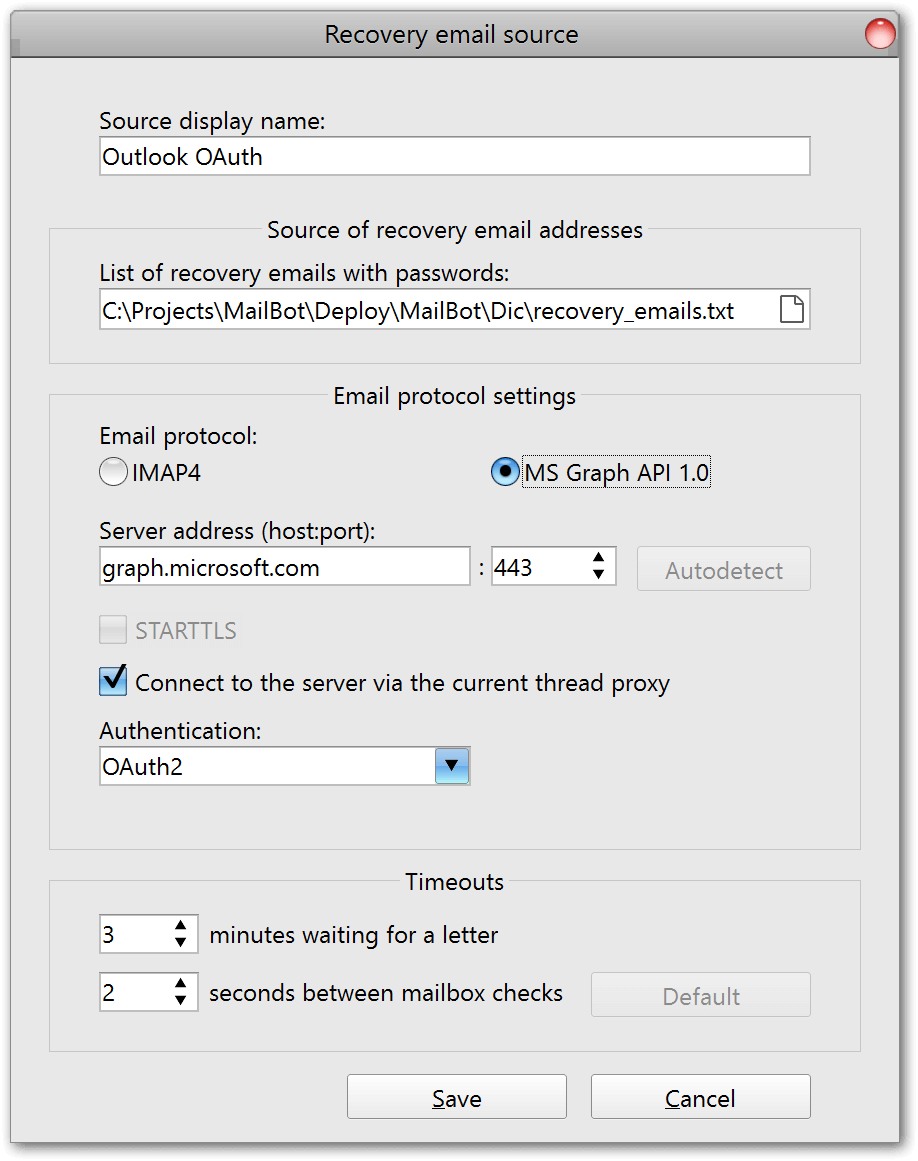 Important! The “MS Graph API 1.0” setting only works for Outlook/Hotmail mailboxes that are equipped with an OAuth2 refresh token generated using the Graph API scope for reading email: Mail.Read, Mail.ReadWrite, etc. If you have purchased Outlook/Hotmail accounts, the stores currently indicate the scope with which the refresh token was generated: