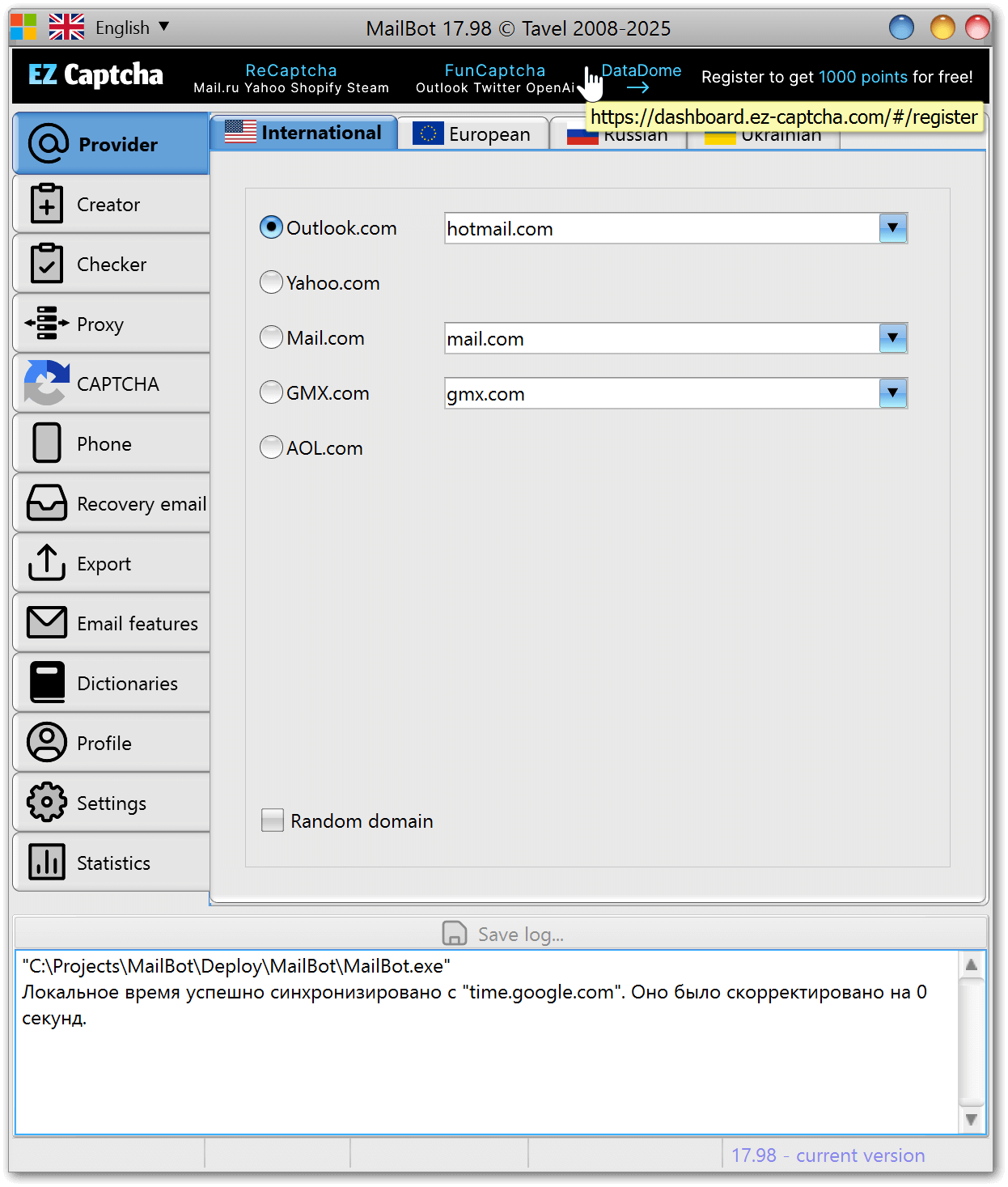 - Option also includes an active link to the site of your CAPTCHA solving service in this section: https://tavel.in/en/mailbot/#CAPTCHA
