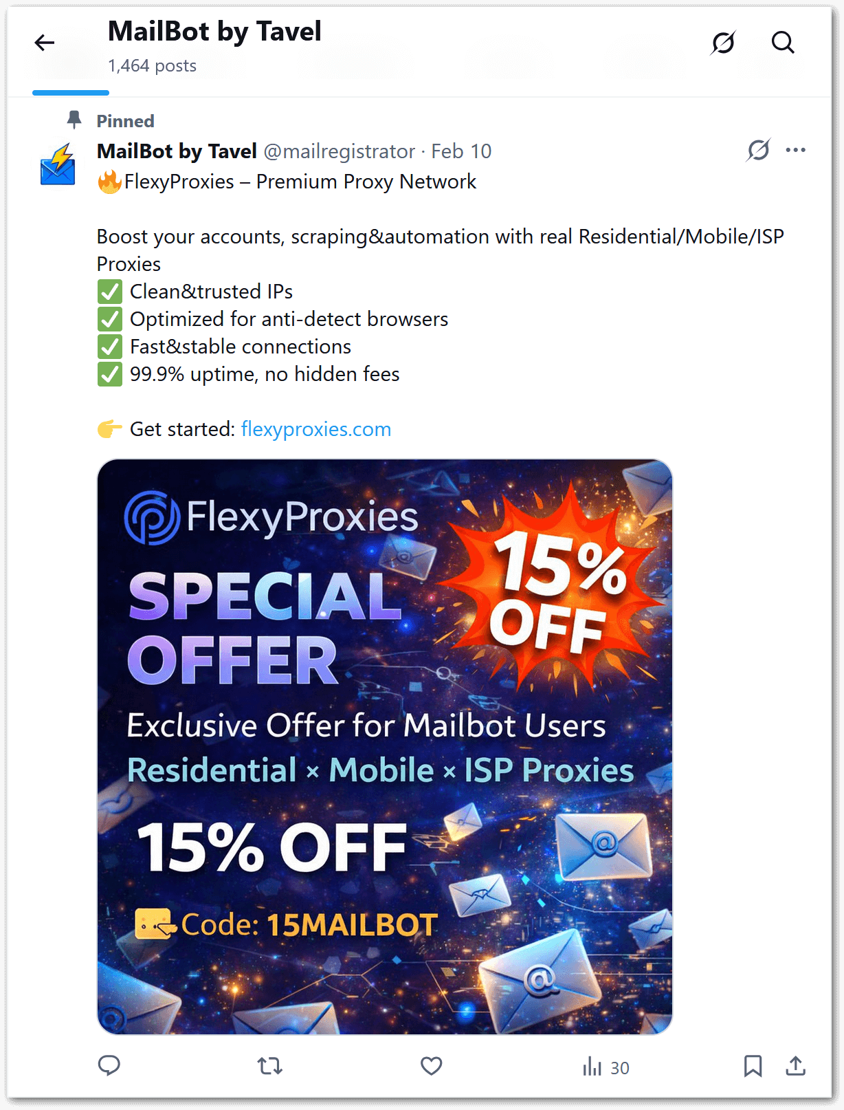 Traffic from all channels is highly targeted and consistently converts well in topics such as account stores, proxy providers, SMS activation services, CAPTCHA solvers, email marketing software, etc.