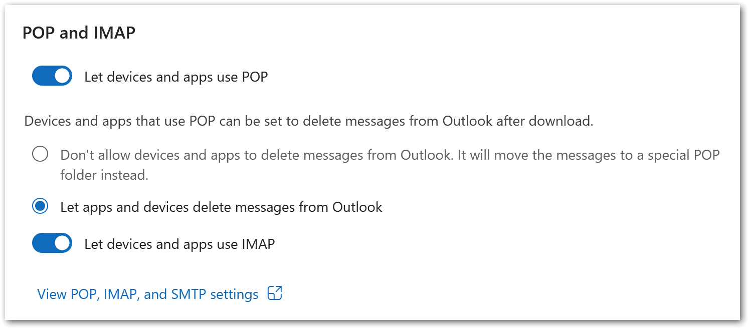 You won’t be able to activate POP/IMAP in a newly created Outlook account, even if you create it manually in a browser, confirm your recovery email, and enable the “POP” and “IMAP” switches in the “Forwarding and IMAP” section of your account settings: